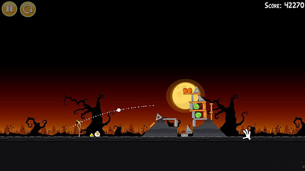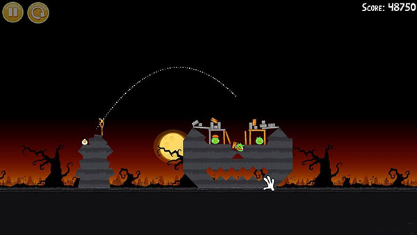 1-13:第一个回旋鸟按图中轨迹击溃建筑整体(有一定几率一鸟全灭),第二只鸟的位置跟第一只鸟差不多,只要击中位置网上一点即可,要确保左边的石砖倒向南瓜堆,一定要砸南瓜堆,否则无法三星!