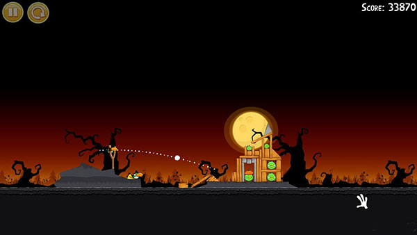 1-17:第一个炸弹按照图中轨迹首先摧毁建筑结构和南瓜(一定几率一鸟全灭),第二加速鸟非常重要,需要准确击中右边的木条,让右边的建筑往左边倒!