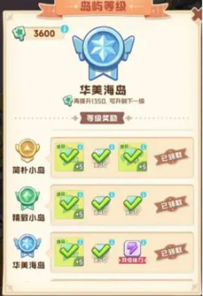 1、小岛装扮值可以解锁奖励,第五档华美海岛可解锁双倍体力功能。