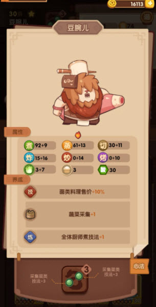 2、主线任务50:制作15份优级牛肉煎包,奖励500金币。怎样才能做到优级呢,简单点理解就是厨子数值是菜谱的两倍,举个简单的例子:糖番茄要10点切技法,若要达到优级则厨师需要20点切技法,特级则要30点切技法,神级则是40点切技法。这个任务只要厨师切30炸50就行了。