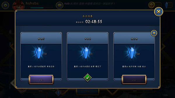 1、任务:在游戏的大厅页面点击任务可以查看每日任务,这里每天会为大家派出三个任务。