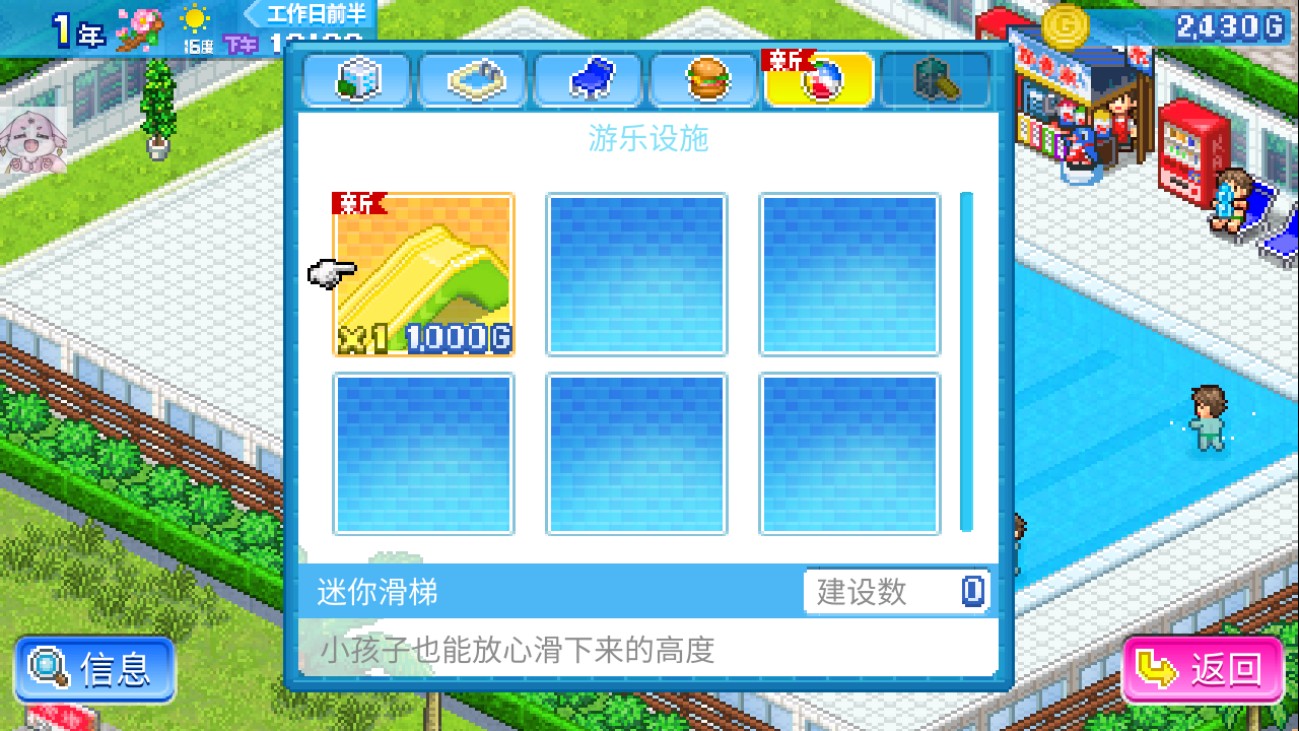 2. 自由建设玩法:玩家可以自由设计水上乐园布局,摆放各种游乐设施。