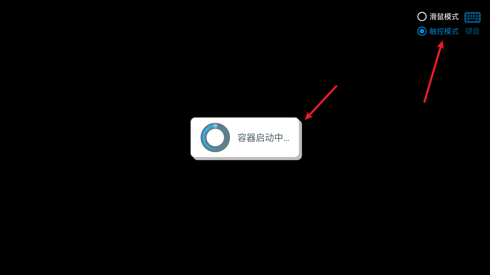4、启动后会进入黑屏状态,这时候等待加载好就行了,右上角还能调整键盘或者触屏模式。