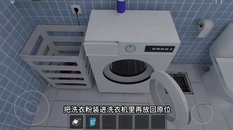 3、来到卫生间,将洗衣粉放入洗衣机中,最后将洗衣粉放回原来的位置,搜索完毕后记得关灯关门。