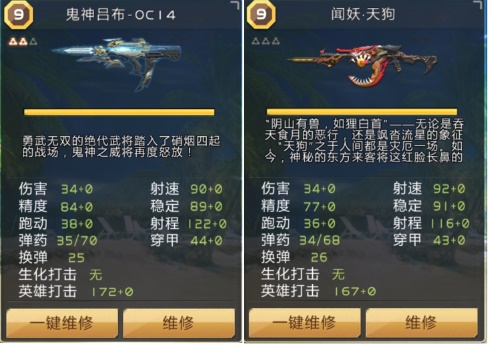 由于OC14目前没有同系列武器,所以拿与之相近的“天狗”进行对比。同级别的鬼神吕布比天狗精度、射程、穿甲、跑动、携弹量更佳,反之稳定、射速、换弹速度差一些。