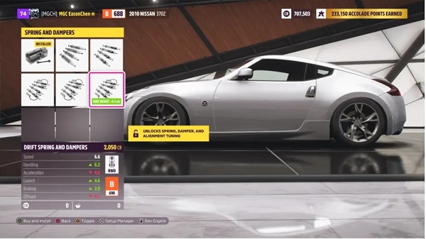 近两年,随着各种漂移赛事的热度逐渐升高,极限竞速也开始注重起漂移这种赛车技巧。 那么什么是漂移?漂移并不意味着失控。车辆打滑导致轮胎空转与地面摩擦产生烟雾也并不能称之为漂移。真正的漂移动作,在从起飘到入弯再到出弯全程都是可以控制的。 而在练习漂移之前我们也需要对车辆进行改装,下面以Nissan?370Z为例:
