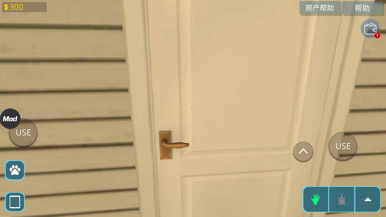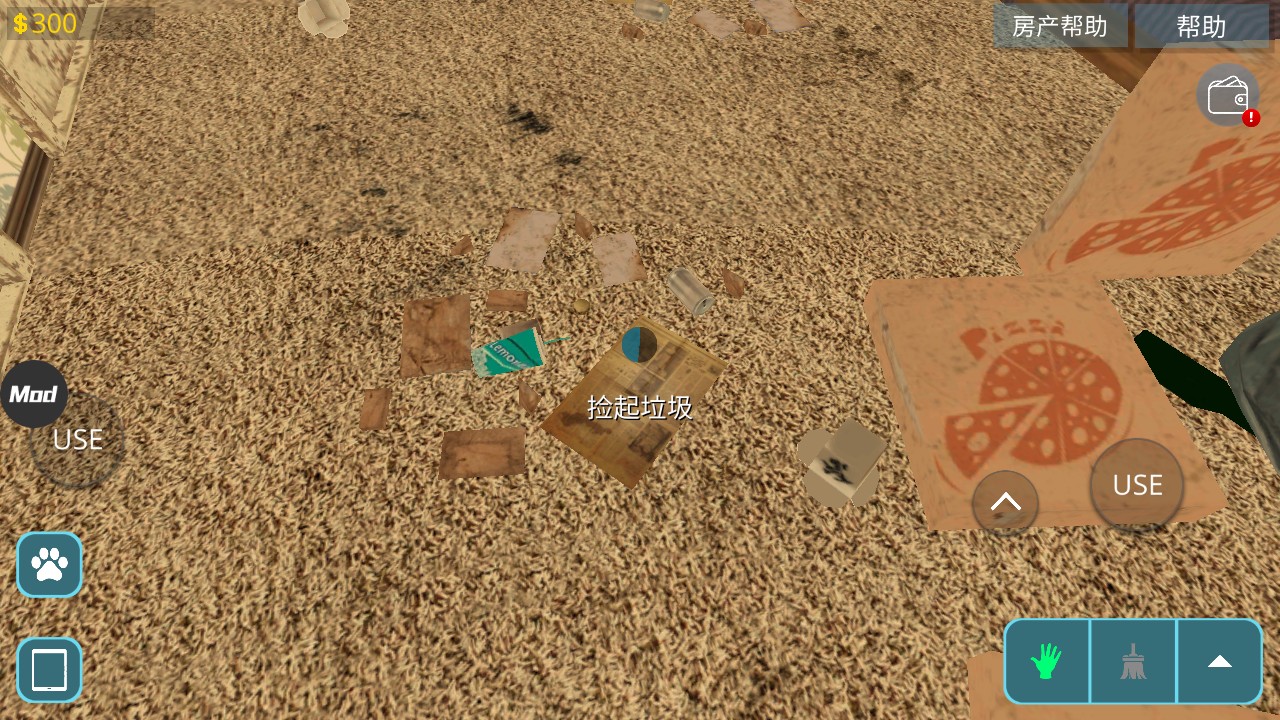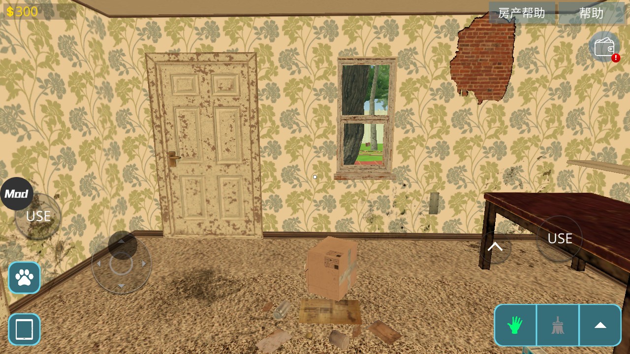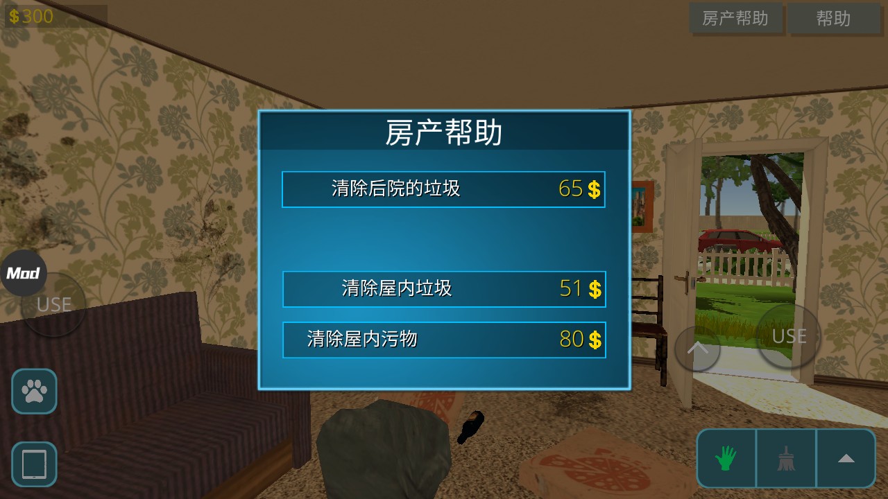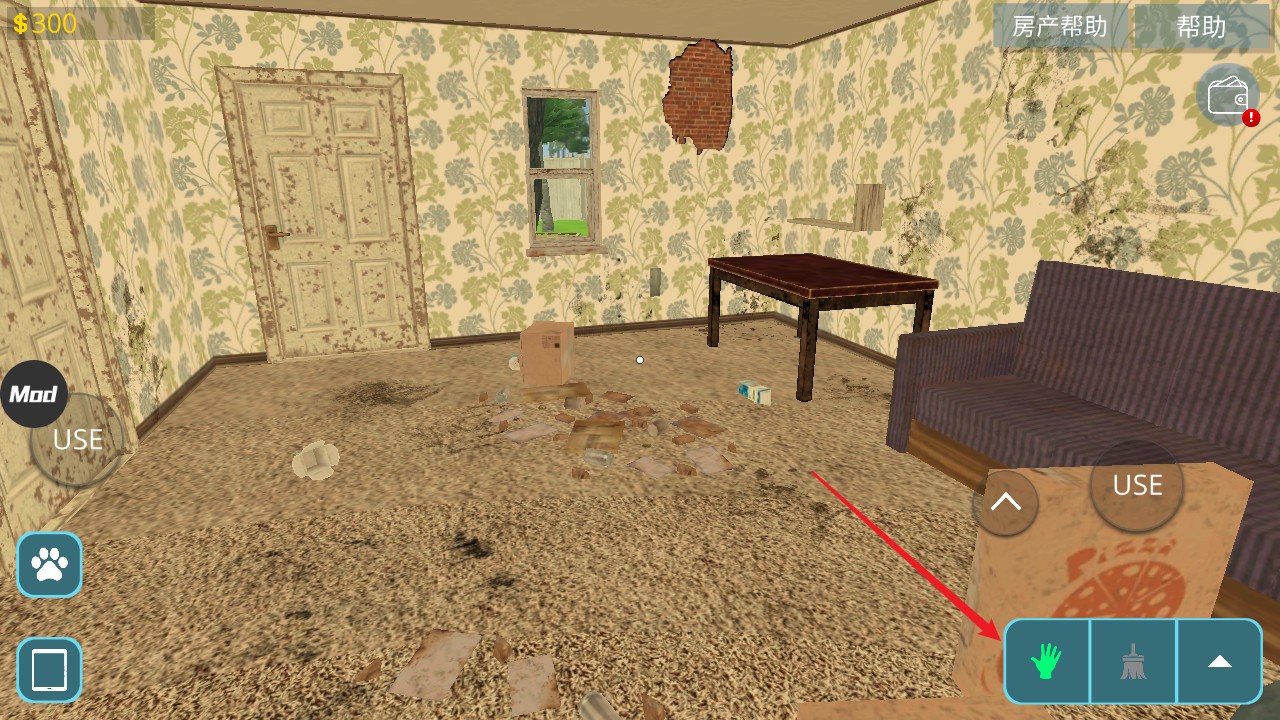 4、游戏右下角是打扫工具,拖把可以清洁污垢,用铲子涂抹墙面的腻子,事先沾上油漆,可以用油漆辊涂刷墙壁,修剪机修剪草坪,耙子来恢复被压坏的草坪。
