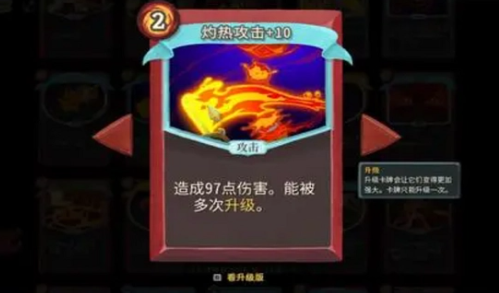 攻击:前期选择好之后,尽量选择篝火较多的路线。这张卡可以无限强化。强化次数越多,攻击越高。是杀戮尖塔中单卡输出最高的牌。