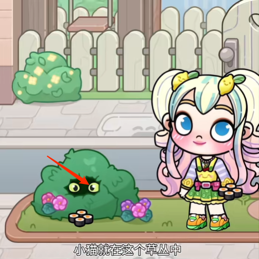 4、将做好的寿司拿到公告栏旁的草丛中,这样就能找到小猫咪了。