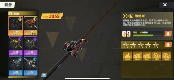2、鱼竿:鱼竿与渔场一样,一共也是四个等级,分别是T1,T2,T3,T4,每个等级的鱼竿只能在对应等级的渔场钓鱼,鱼竿通过打开金色宝箱获取,重复获取的同一鱼竿会变成碎片,用于对鱼竿升星,升星可以解锁鱼竿技能,带来更高的钓鱼伤害。钓鱼主要使用金色鱼竿,升级到69级左右即可钓上这一级别的所有鱼包括典藏,鱼竿升级消耗金币与碳布,碳布主要来源是通过打开宝箱与转盘获取。鱼竿升级后无法重置消耗的金币与碳布,金币在20级左右就会开始溢出,主要稀缺的是碳布,所以不要升级金色以下的鱼竿,前期可以用送的光轮3000过渡。