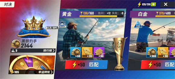 6、对决:对决在不同场获得的荣耀分数,消耗的体力不同,更高的场可以获得更高的荣耀分数,以及杯数提升,可以从游戏中点击对决进行查看。对决是两个人进行比赛的模式。匹配到对方后,开始钓鱼。结算方式目前有三种,其中两种为,标准模式与最大。标准模式结算模式,就是看两个人在三分钟内掉起来的鱼的数量积分总和,积分高的一方取得胜利。最大结算模式,将自己在三分钟内掉起来的分数最高的六条鱼分数相加得到总分,与对方的最高分数六条鱼总分进行比较,高的一方获胜。