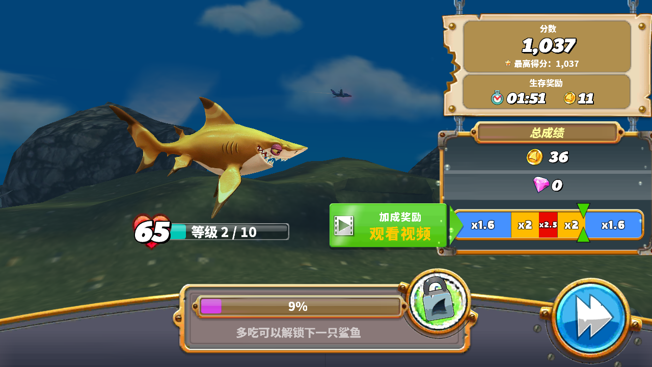 2. 成长与进化:通过不断进食积累经验值,升级后可以提升属性并解锁更强大的鲨鱼。