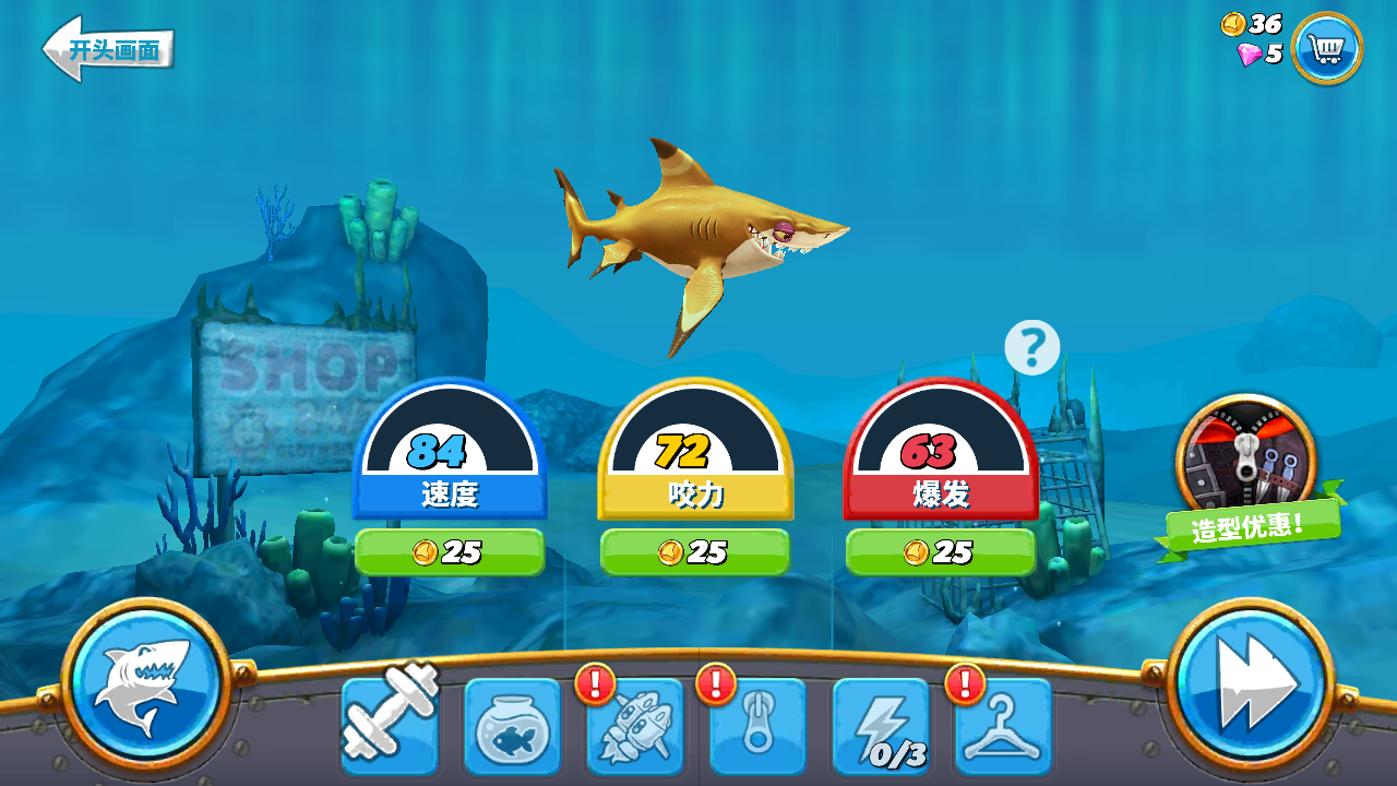 6、玩家还可以通过给自己的鲨鱼升级来提高他们的速度、咬力以及爆发力。