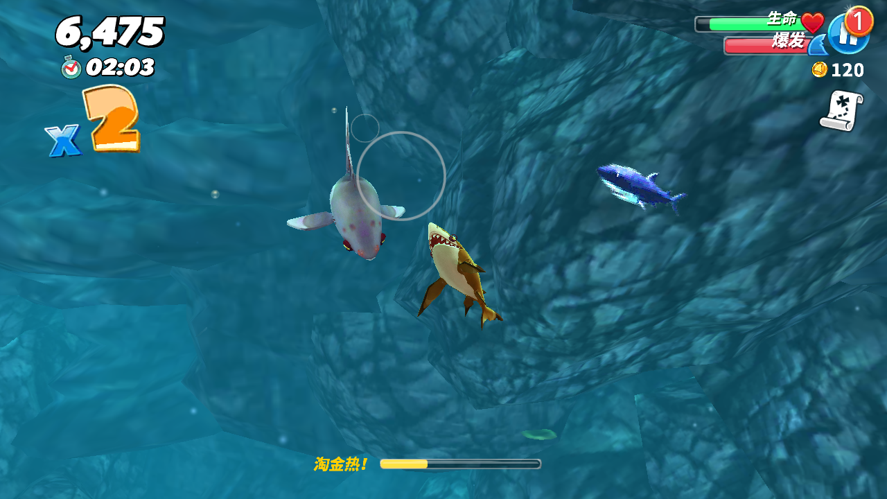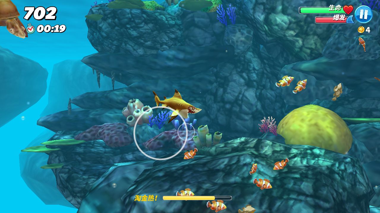 2、左手虚拟键盘操控鲨鱼的移动,右边长按可以让鲨鱼爆发,更加快准狠的吃到食物。