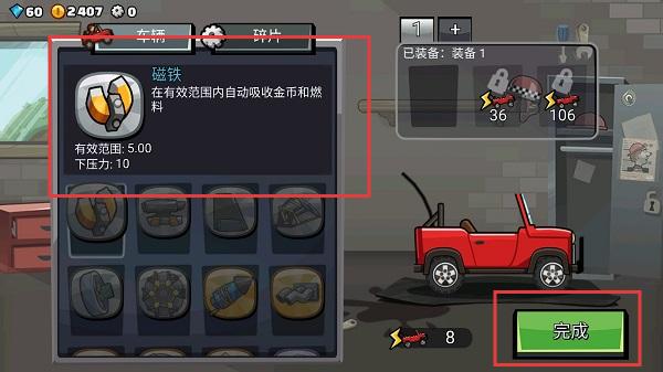 4、在部件系统里,可以对汽车增加一些新的部件,增加汽车的性能。在新手阶段,我比较推荐带重型、磁石、着陆助推力三种部件。重型,可以增加赛车的重量,降低赛车的重心,使赛车在行驶时能够更加的平稳。磁石,可以收集燃料和半径更宽的金币,可以更快的积累足够的金币来对赛车进行改造升级。着陆助推器,可以在赛车跳跃落以后,获得一段冲刺,拉开与其他赛车的距离,获得更高的评价。