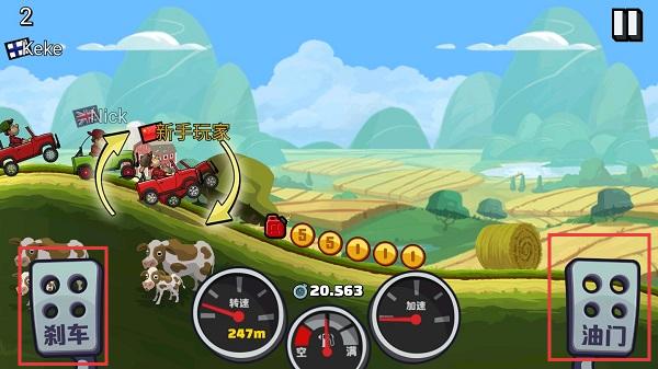 1、游戏的操作方式是非常的简单的,屏幕右下角的虚拟按键是油门,可以通过按压程度的不同,来给车子进行加速;屏幕左下方角的虚拟按键是刹车,可以对车子进行减速。这个按键还有一个非常大的功能,就是在我们的车子快要翻车的时候,松开油门,点击刹车,就可以矫正我们的车子,使车子不会翻。