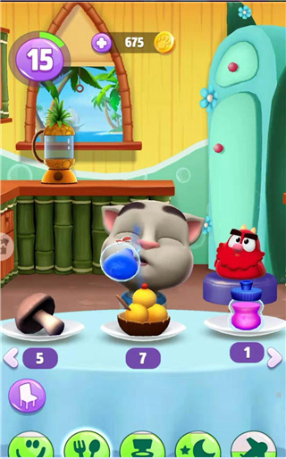 点击这个按键会带汤姆猫到餐厅,桌子上摆着的东西,玩家可以喂给我们汤姆哦。