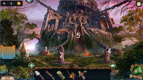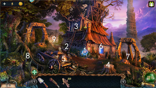 9、图中1处使用镰刀,获得第五块和尚雕塑;2处获得钥匙,再用铲子挖开土,得获得音乐盒鼓。