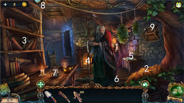 15、农具间内,图中1获得能量球;2处获得大叉,对6处使用大叉获得第六块和尚雕塑;3处点击阅读得到线索哈芬斯,4处得到捕虫网,5处得到第七块和尚雕塑。