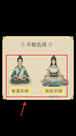 2、选择普通天赋直接开启修仙之路,或通过观看广告获取绝世天赋提升起点。