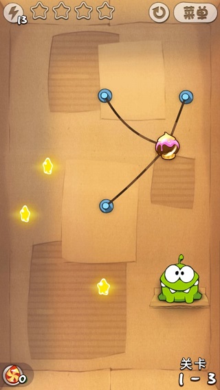 第三关与第二关同理,需要玩家掌握摆动的角度,首先切断右侧的第一根,在糖果触碰到星星的最高点立马切换上方的第二根,之后第三颗星星也就自然的收入囊中。