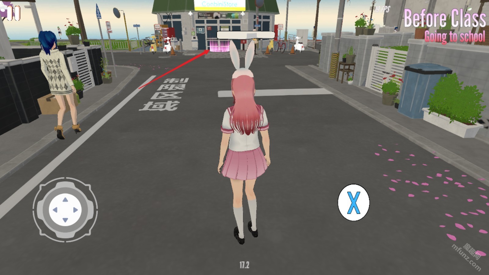 3、除了家门之后,按照箭头的指示向前跑,就可以一路来到校园当中了。