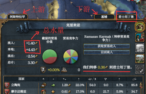 “君士坦丁堡”是奥斯曼的贸易本部,有三条支流汇入了“君士坦丁堡”节点,你在这放一个商人收钱,等于把水流拦腰截断,抽走了一部分,你能在一个节点能抽走多少水,取决于你在这里的“贸易竞争力”和这里的停留的总水量,所以到处乱抽是没有意义的,此处先假定你不改变开局自带的贸易本部。