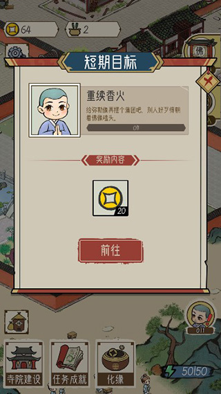 4、开启化缘—下山化缘,便有机会获得丰富的道具和相关事件,从而更好的建设寺庙。