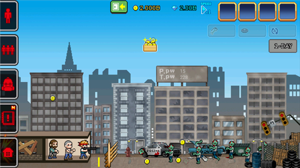 2、这款游戏的操作简直不要太简单,虽然主角手里拿着枪射击,但是1不用瞄准,2不用走位,只要手指点击屏幕,主角就会开火攻击前来侵略的僵尸。击杀僵尸掉落的金币也不用自己去捡,金币掉落后过几秒系统会自动捡起金币的。