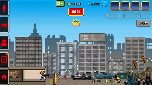 4、操作之后自然就是游戏的玩法了。刚进入游戏时我们只有一人一枪,通过击杀僵尸来获得金币,金币可以用来升级我们的角色,营地,还有解锁同伴,游戏中当我们击杀足够多的僵尸时,就会出现召唤boss选项,当你觉得自己足够强大时,就可以点击屏幕上方的boss图标召唤boss出来,击杀boss之后我们就会直接进入到第二天。而我们的目的就是击杀所有来犯的僵尸,支撑到100天。