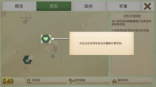游戏经济树分为民生、政府和军事。这些科技点,均需要依靠金钱加点维持,投资民生,可以增加民众的支持度,但也会导致通货膨胀和腐败风险,通货膨胀只能靠时间自动下降,而腐败需要投资政府来遏制腐败。