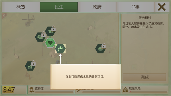 想要快速击败叛军势力,选择空袭,也可能会伤及无辜,导致平民怨气,另外军事行动也必不可少了金钱,如何平衡支出和收入也是玩家所要面临的一大难点。