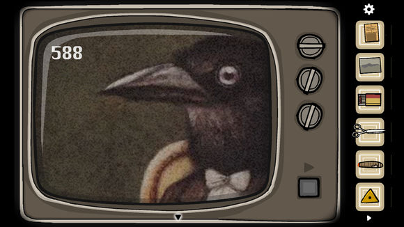 还记得第二张胶片吗,打开投影仪,取出胶片1,放入2,去对面会发现投影出一个画圈的照片,一头雾水。拉起投影布会得到提示:TV 588。并且仔细观察,发现五个圈分别圈着五个东西,旁边写着对应的符号。打开电视收看588,会得到顺序。按照出场顺序:乌鸦,主角,女人,蓝色药瓶,黑影。记录下他们对应的符号。