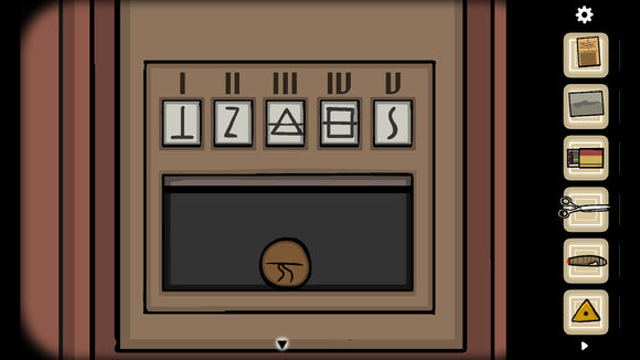打开柜子后,拿到拉手,打开装证据的文件夹后得到磁带,胶片与报纸。回到房间,电视下面有两个插头。左边断掉了,先接上右边。回到柜子发现投影仪可以工作了,放入胶片,点击上面的旋钮打开,去对面看那幅画。把拉手装在画上的投影布上,拉下投影布,按照参照物,先是对齐红色柜子顶,得到数字V和符号X,再对齐镜子,得到熟悉IV和符号·。别忘记拿投影布左上的照片。
