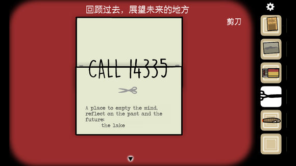 来到打字机,输入the lake,会打印一张纸,上面画个剪刀很明显是要你剪开,剪开后拼一下,得到打电话的提示。