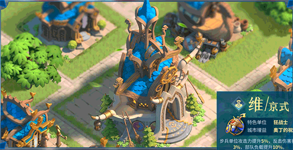 特色单位是狂战士,有奥丁的祝福,步兵单位攻击力提升5%,反击伤害提升3%,部队负载提升10%。维京文明是一个不错的选择,该文明提供步兵单位攻击力提升5%,反伤能力3%以及部队负载提升10%,可以更好的去抢夺他人的资源,来帮助自己发育。不甘愿种田发育,毕竟那样过于佛系,维京文明扫田,撞堡等等都有优势。建筑样貌还算不错。