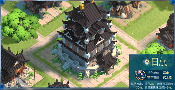 3、日式文明前期不错,部队攻击力提升3%、行军速度提升30%、资源采集速度提升5%。该属性可以对全兵种加成,同时30%行军速度加成,该属性非常强势,开局开迷雾有很大作用,资源采集速度提升5%也是可以的,日式文明和中式文明一样,可以帮助玩家采集资源等!再者日式文明还有一个特点,那就是攻击力比较高,后期走步兵的玩家可以选择,但相比其他文明,该文明显得有一些“鸡肋”。