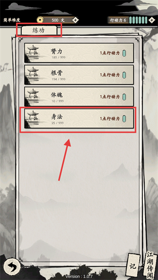 3、练功时可消耗1行动力提升【身法】等属性,合理分配行动力,积累功力完成任务目标。
