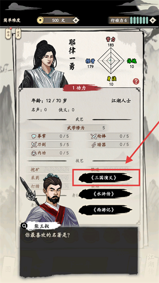 2、与张三叔互动选名著,如选【三国演义】,或影响剧情、获取属性加成,需积极参与。