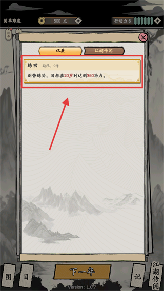 1、关注练功任务,9年内规划行动,确保20岁前功力达【350】,可通过练功提升属性来完成。