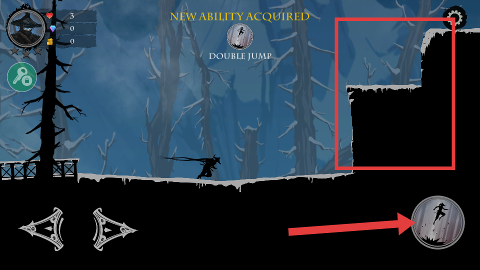 4、获得【DOUBLE-JUMP】技能后,点击右侧跳跃按钮,可进行二段跳,跨越红框内的高墙体障碍。