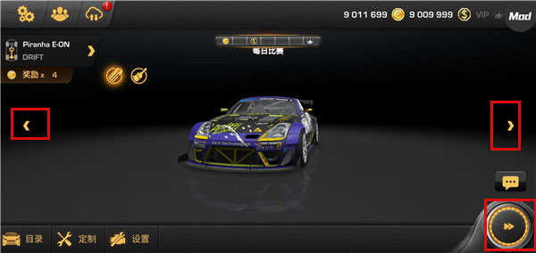 1、回到我们的游戏主界面后,点击屏幕右侧的箭头按键可以使用不同的赛车,点击屏幕的右下角进行游玩。