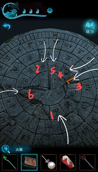 5、如图调整旁边的锁,这个锁的密码是1是开头我们看见的女纸人,二是树,三是月亮,四是佛像。打开抽屉之后可以在抽屉当中拿到枣糕。