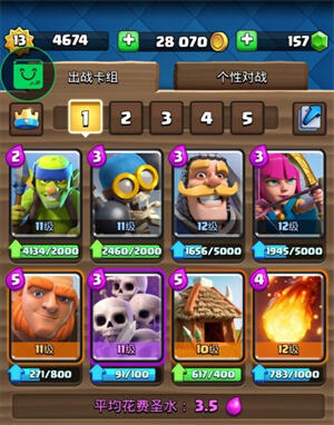 卡组搭配:骷髅军团+哥布林飞桶+飞龙宝宝+野蛮人滚桶+哥布林小屋+火球+骷髅墓碑+猎人,平均消耗圣水3.5。