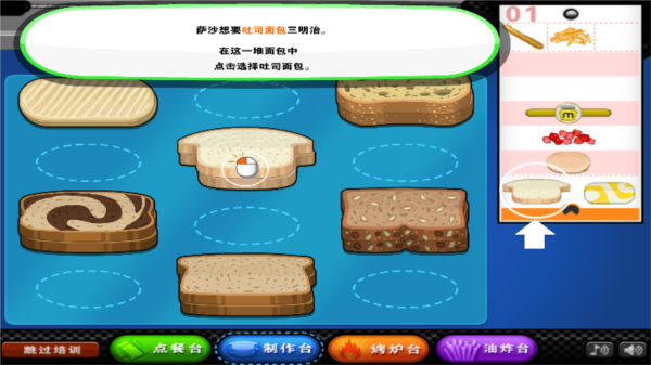 6、进入制作台,按照顾客要求选择正确的食材。例如:我这位顾客要的是吐司面包三明治,所以先在一堆面包中选择吐司面包。