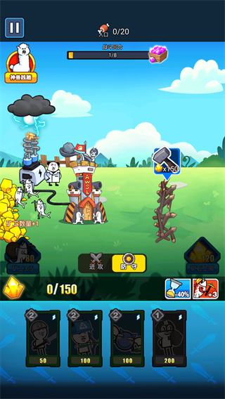 防御塔系统:防御塔有四种形态,虽然形态和攻击方式有些差异,但是增加的属性其实是一样的,都是加10%的防御和150的生命值。要选择的话看个人喜好,我选的是连弩塔,感觉还是机关枪帅一点。这四种防御塔碎片是可以通过商店观看视频获得,入手难度不大,就是麻烦点要看会视频。