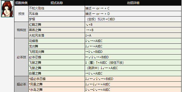 技能:凤凰之舞、飞翔龙炎阵、龙炎舞、火之乱舞、必杀忍蜂、水鸟之舞。