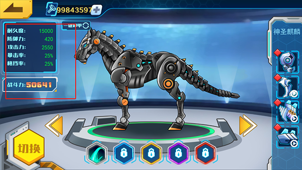 2、在机甲仓库中可解锁各种不同的机甲,在左侧还会显示属性和战斗力