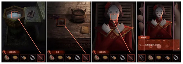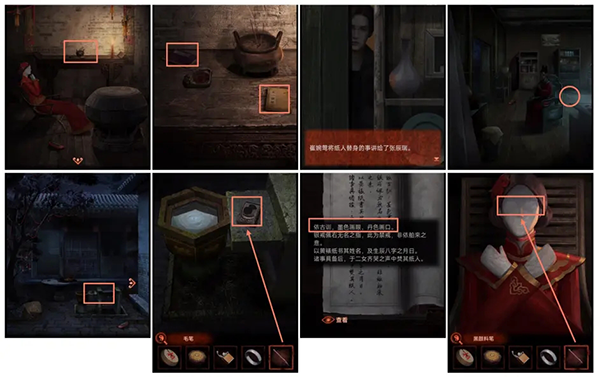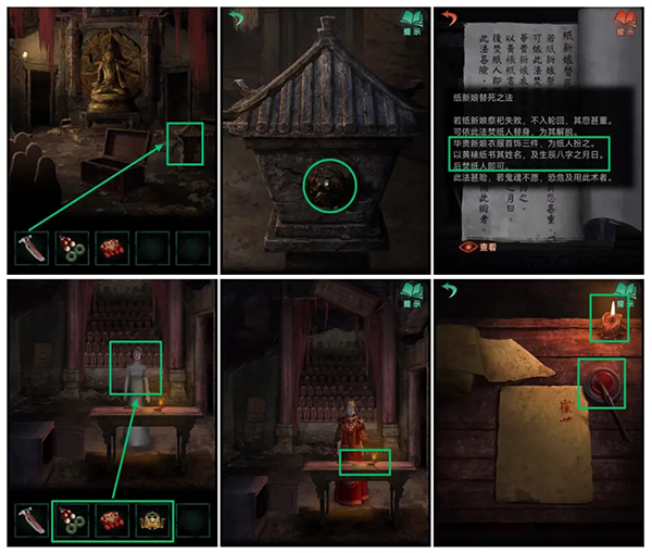 58、张辰瑞:点击石灯,用【多功能工具】锤爆石灯,拿到【凤冠】。根据《六转妙法录》,将【一对耳环】【凤冠】和【金丝嫁衣】给纸人穿戴上,点击桌上的笔写下姓名和生辰,再点击桌上的蜡烛点燃纸人。