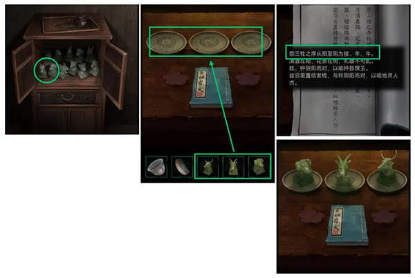 31、拿到【猪头雕像】和【羊头雕像】,根据《告祖祭文》的提示,将三个【X头雕像】放在正确的位置上。